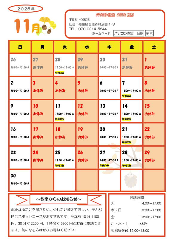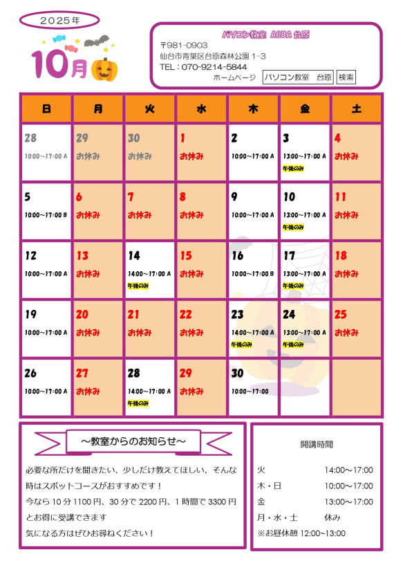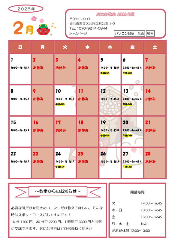 >>パソコン教室AOBA台原について詳しくはこちら →パソコン教室AOBA台原の特徴